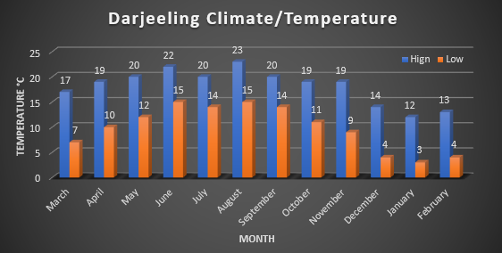 From October through March, the weather drastically changes; by the end of October, there is a light chill in the air. The coldest part of winter, which lasts from the middle of November to the beginning of January, with temperatures between 7 and 5 degrees Celsius. The start of the city’s summer season is from April to June. Darjeeling is nice and not overly hot throughout these months. The maximum temperature is 25 degrees. It’s perfect for exploring the tourist attractions because of the strong sunlight that pours in. Again, September is a great month to travel because there is less rain and more lush vegetation at this time of year.